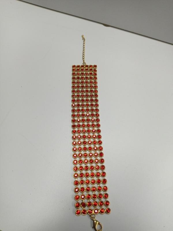 браслет широкий, из желтого металла украшен красными камушками..ухаживает очень нарядно.красный