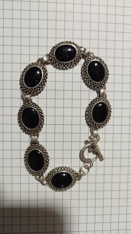 Красивый необычный серебряный браслет или с черным ониксом, будь то с черным агатом. Очень гармонично смотрится с кабелькой, которая продается отдельно. Стан идеальное, длина - 21 см.