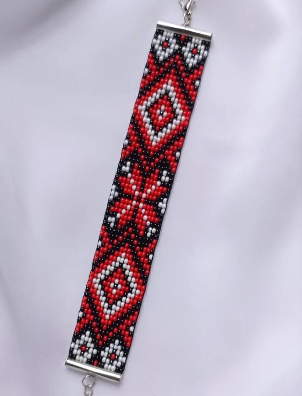 Браслет із чеського бісеру Preciosa, виконаний в українському стилі. ❤️🖤 кольори роблять його яскравим та стильним. Він чудово доповнить ваш повсякденний образ, і тапож підійде до українського вбрання. Ширина 2,5 см, довжина 17, 5 см, подовжуючий ланцюжок 5 см. Фурнітура використана під срібло. Є подібні браслети в іншій кольоровій гамі, як на останньому фото. Всі подробиці замовлення обговорюються ще до оформлення