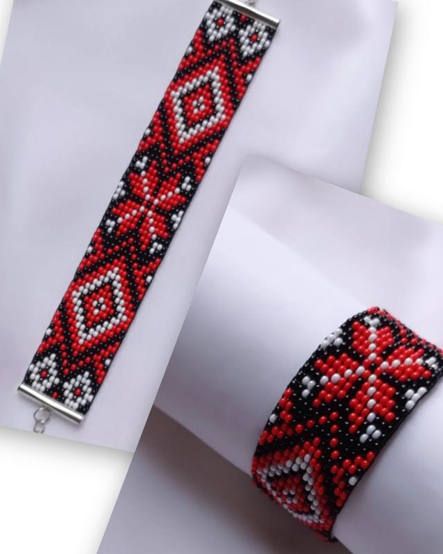 Браслет із чеського бісеру Preciosa, виконаний в українському стилі. ❤️🖤 кольори роблять його яскравим та стильним. Він чудово доповнить ваш повсякденний образ, і тапож підійде до українського вбрання. Ширина 2,5 см, довжина 17, 5 см, подовжуючий ланцюжок 5 см. Фурнітура використана під срібло. Всі подробиці замовлення обговорюються ще до оформлення