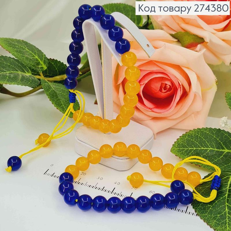 Браслет синьо-жовтий, з напівпрозорих бусинок, на затяжці