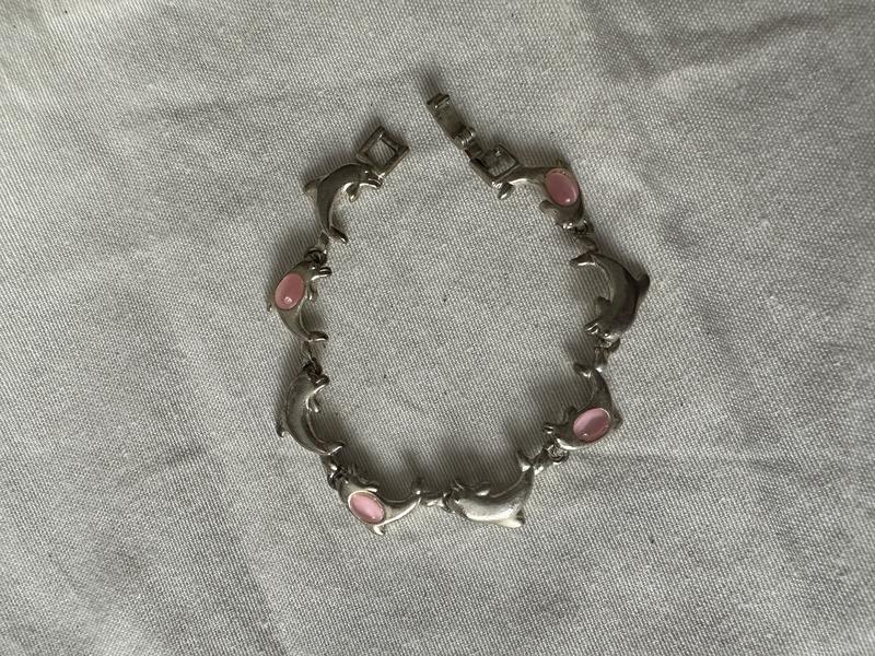 Браслет в цвете серебро с розовыми камешками в виде дельфинов