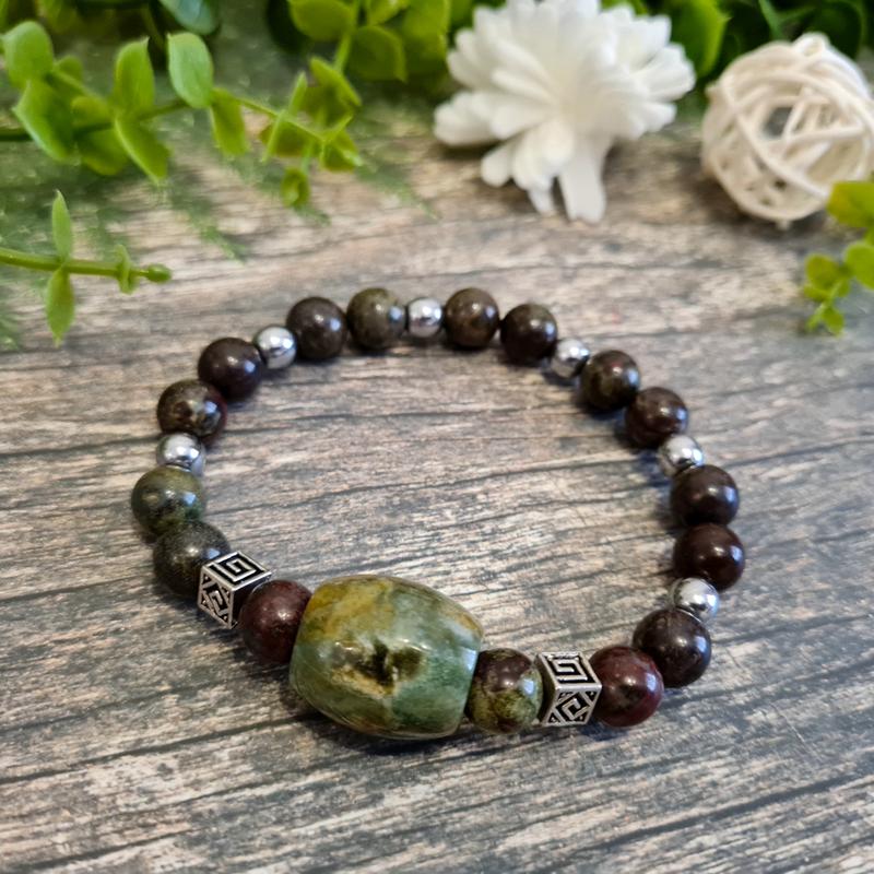 🐲🍀Амулет! Браслет резинка из натурального камня яшма кровь дракона, яшма унакит с фурнитурой серебряного цвета. Центральный элемент браслета – большая бусина из яшмы унакит. Размер бусин - 8 мм и крупная бусина - 2х1 см, 2 размера браслета: на обхват руки до 18 см и до 21 см. Это украшение является мощным амулетом. Яшма "Кровь дракона" является целебным камнем, способствующим мужеству, жизненной силе и оздоровлению. Этот камень будет поддерживать вас и заземлять. Независимо от того, какие вызовы встретятся на вашем пути, вы останетесь сильным и устойчивым.