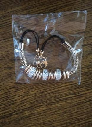 Браслет золотистого цвета состоит из металлической и текстильной частей, украшенный декоративными вставками из стекла. Размер браслета: 18,5 + 2,5 см, размер металлической части - 10 см (длина). Диаметр декоративных элементов - 1 см. Длина регулируется.