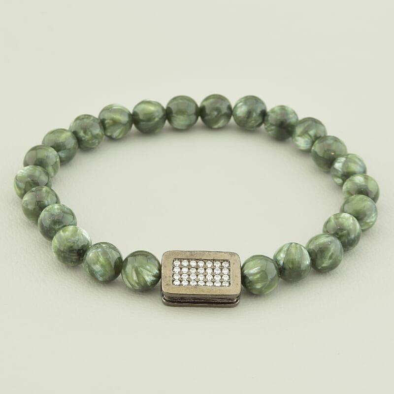 Артикул: 121912 Размер камня Бренд: SUNSTONES Вес: 23,4 г. Диаметр: 8 мм. Длина: 20 см. Камень: Серафинит(нат.) Качество: Хорошее Материал: Медный сплав Покрытие: хром Тип замочка: Без замка (Резинка) Форма товара1: Шарик Цвет: Серый Цвет3: Черный