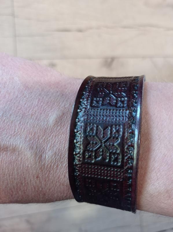 Кожаный браслет ручной работы с противосненым украинским орнаментом. На обхват руки - 18 см. Ширина браслета - 2,7 см. Товщина шкіри - 2 мм. Цвет коричнево-бордовый, меняется в зависимости от освещения. Застежка - кнопка.