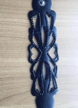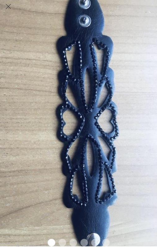 Цікавий браслет перфорація, застібка на кнопку, дві довжини, прикрашений чорними камінчиками, що переливаються. Довж -22, ш -5, до першої кнопки в застебнутому вигляді -21, до другої кнопки в застебнутому вигляді -19,5 . Відповім на всі запитання, відправлю зручною вам поштою після оплати на картку Приват чи Моно,читайте розділ» про мене», беспечна оплата і накладний платіж тільки Нова пошта