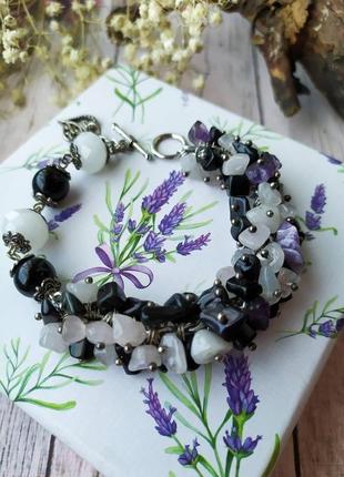 Оригінальний асиметричний браслет з сколів натуральних каменів: агата, рожевого кварцу, аметисту та кришталевих намистин, обрамлених металевою фурнітурою кольору зістареного срібла. Підходить на зап'ястя обхватом 17 см.