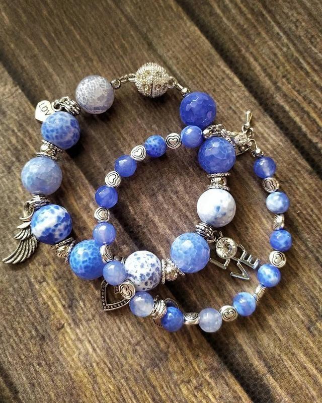 Превосходный агатовый сет "Формула любви". Нежный и яркий одновременно. Граненные полупрозрачные бусины голубого агата разной величины смотрятся фактурно и нарядно. Романтические металлические подвески серебряного цвета украшают этот замечательный набор. Браслеты великолепно смотрятся в паре, однако возможно приобретения каждого браслета отдельно. Цена за пару. . #браслетукраина