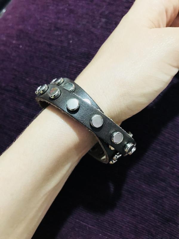 Браслет из эко кожи коричневого цвета с плоскими заклепочками серебряного цвета, застёгивается на кнопке