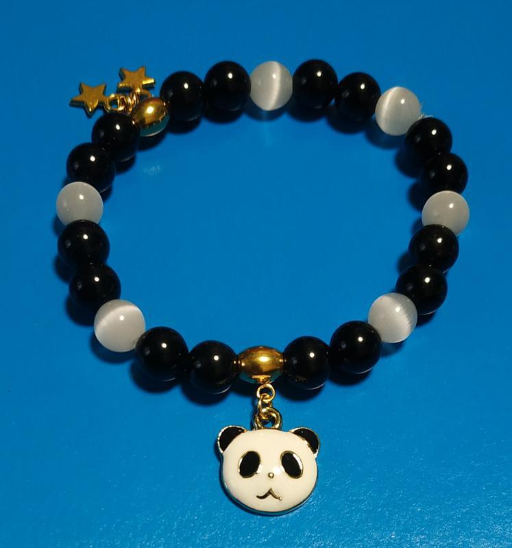 Торг Браслет на гумці з підвіскою – панда. Обсидіан і котяче око. 18,5 див.