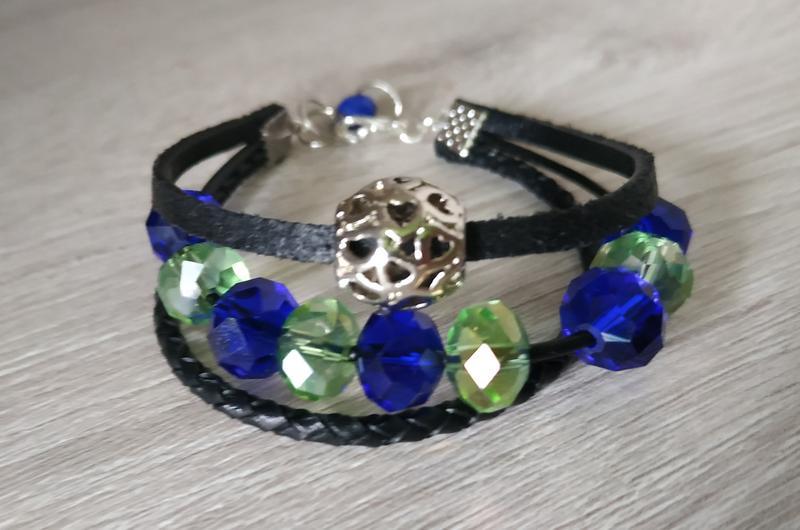 Браслет из натуральной кожи и бусин. Размер 16,5 см (регулируется до 18 см).