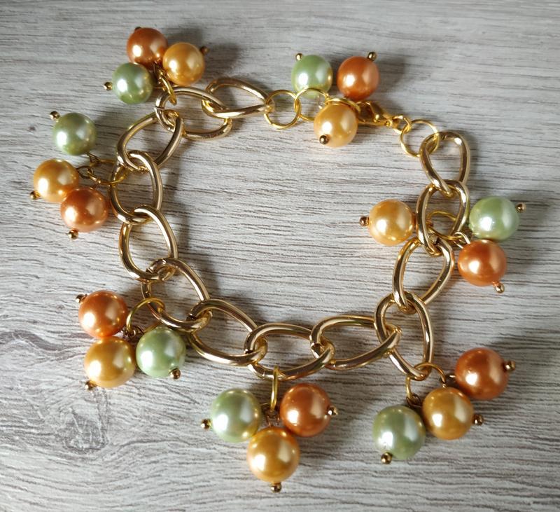 Браслет на цепочке под светлое "золото", на замочке. Бусины - жемчуг Shell Pearl, три цвета. Размер 16 - 17,5 см.