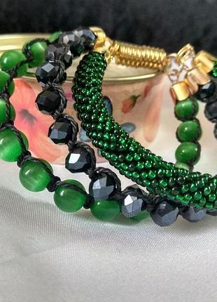 Тройной браслет из чешского бисера, камня "кошачий глаз" и хрустальных бусин. Браслет выполнен на мемори-проволоке, держит форму на ручке, магнитный замочек. Подойдет на запястье 15-16 см. Бусины обвязаны узлами шамбалла. Дополнительные характеристики: Цвет : Зеленый Цвет : Черный Материал : Бисер Материал : Бусины Материал : Шнур
