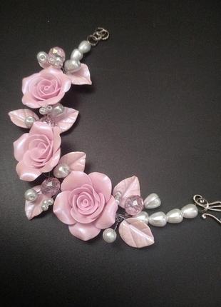 Браслет с перламутровыми розами из полимерной бельгийской глины. Авторское украшение ручной работы. Очаровательное украшение из роз ручной работы, изумительного грушеводного жемчуга Майорки, хрустальных розовых кристаллов. Цвет украшения сиренево розовый. Покрыт перламутром, при различном освещение цвет меняется. От бледно розового до нежно голубого. Браслет подходит под колье жемчужная нежность Дополнительные характеристики: Цвет : Розовый Камни / вставки : Жемчуг Материал : Полимерная глина Персонализация : С гравировкой