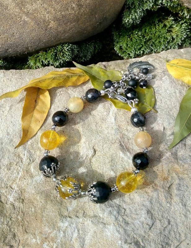 Браслет из натуральных камней (Желтый кварц-волосатик, черный агат, шунгит). Использована американская винтажная фурнитура класса Люкс, покрытая оксидированным серебром 925 пробы.Размер: от 16,5 до 19,0 см, увеличивается за счет колечек или удлинительной цепочки (по желанию). Желтый кварц-волосатик. Однажды, решила богиня любви Венера искупаться в горном озере. Разумеется, для этого ей пришлось спуститься с Олимпа на Землю, где время течёт гораздо быстрее, чем на «божественной горе». Купаясь в прохладной и чистой воде, богиня и не заметила, что потеряла свой золотистый локон. Когда она спохватилась, то было поздно: толстый лёд сковал горное озеро. Но Венере удалось отыскать свой локон, вмёрзший в лёд. Залюбовавшись столь необычным зрелищем, она захотела подарить эту красоту людям. Воспользовавшись своими божественными возможностями, Венера превратила кусок льда с вмёрзшими в него волосами в камень волосатик. :) В наше время... говорят такой камень оказывает на организм общеукрепляющее действие и очень способствует долголетию, а для женщин он полезен тем, что помогает предотвратить гормональные сбои.