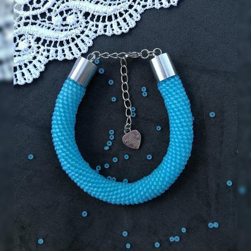 Бисерный жгут из матового бисера голубого цвета. Длина 17 см + 5 см удлинительной цепочки, диаметр 10 мм. Качественная фурнитура из нержавеющей стали. Дополнительные характеристики: Цвет : Голубой Материал : Бисер