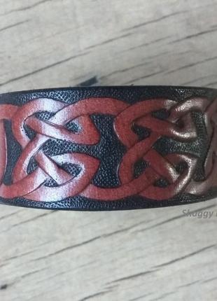 Кожаный браслет ручной работы, выполненный в технике тиснения. Застежка - кобурной винт. Ширина браслета - 3 см. Толщина кожи - 3 мм. Цвет - красное дерево (неяркий). Рассчитан на обхват руки 17,5 - 18,5 см. Дополнительные характеристики: Цвет : Красный Цвет : Черный Материал : Натуральная кожа