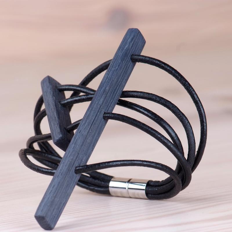 Браслет з масиву вороненого дуба та натуральної шкіри з магнітною застібкою з нержавіючої сталі Дерев'яні елементи переміщуються по шкіряних шнурах, створюючи різні конфігурації Авторський дизайн Незвичайний вигляд Яскравий штрих у вашому образі Вишуканий і демократичний водночас Колекція «Мій час» Подарункова коробочка в комплекті Товар виготовляється на замовлення