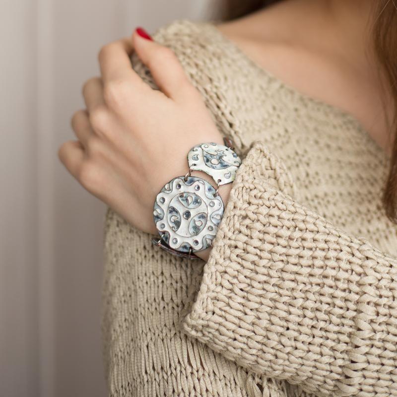 Наразі митець нашої арт лабораторії тимчасово працює в Непереможнім Українськім Війську. Тому прикраси від нього можна буде купити після перемоги. (ціна встановлена щоб не видаляти виріб. Після перемоги актуальні ціни будуть знов додано). Поки у нашому магазині ви можете купити лише прикраси від Жанни. В назві це буде позначено Браслет з ювелірною емаллю. Застібка мідний кований тоглик. Розмір регулюється за допомогою додаткових ланок. При бажанні, можна зняти мідний тоглик та продіти ланцюжок, тим самим перетворивши браслет на кольє. З іншого боку виріб теж вкрит емаллю Авторський браслет ручної роботи від родинної арт-лабораторії з Запоріжжя. Вироби в техніці перебірчаста емаль створює художник-емальєр Павло Марценюк вже понад 20 років. Кожний виріб - мистецька робота з продуманим виразним образом. Всі етапи художник створює власноруч. Емаль сплавляеться з металом при температурі біля 800С*, з іншої сторони прикраса вкривається контремаллю. Ця техніка існувала ще за часів Київської Русі та Візантії і досі зберігаються прикраси оздобленні емаллю, колір та блиск залишилися незмінними з плином часу. Візерунки ювелірної емалі, створені вогнем, неможливо повторити Для того щоб подивитись всі наші прикраси цієї колекції, на основній сторінці майстерні https://firenamel.********** над фотографіями всіх робот введіть "Дощ" у строчці пошуку Додаткові характеристики: Колір: Білий Колір: Блакитний Колір: Сірий Матеріал: Мідь