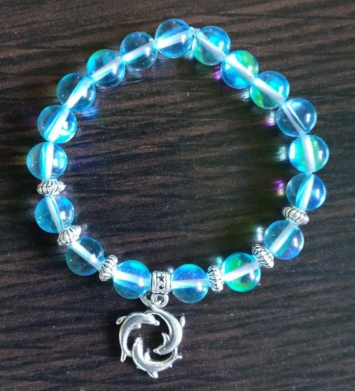 Браслет из опалового стекла с подвеской – дельфины. 17,5 см. Дополнительные характеристики: Цвет : Голубой