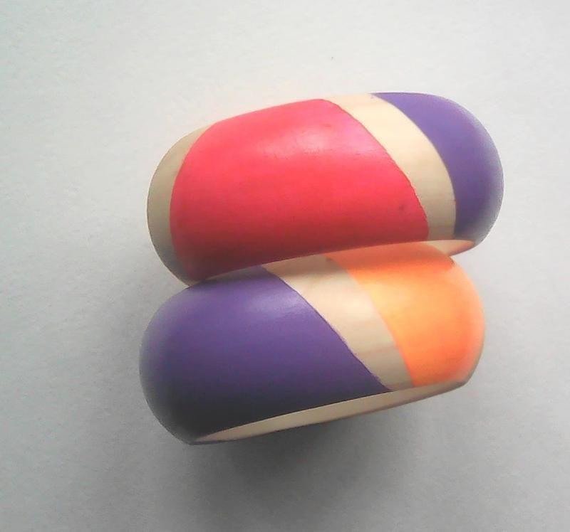 Деревянные браслеты с росписью, акриловые краски, акриловый лак. Диаметр - 70мм., ширина - 35мм./100грн., вместе - 170грн. Дополнительные характеристики: Цвет : Бежевый Цвет : Желтый Цвет : Оранжевый Цвет : Розовый Цвет : Фиолетовый Материал : Дерево