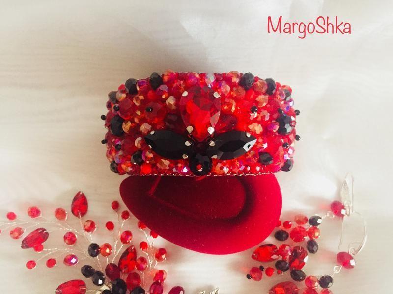 Надзвичайно красивий та шикарний браслет, що стане яскравим акцентом святкового образу! Браслет розшитий кришталевими стразами та намистинами, чеським бісером. Браслет на металевій основі, внутрішня сторона - натуральна шкіра. Ширина - 3,5 см, довжина - 14 см. Можливе виготовленя в інших кольорах. Додаткові характеристики: Колір: Червоний Колір: Чорний Камені / вставки: Стрази Матеріал: Бісер Матеріал: Намистини Матеріал: Натуральна шкіра Товар виготовляється на замовлення