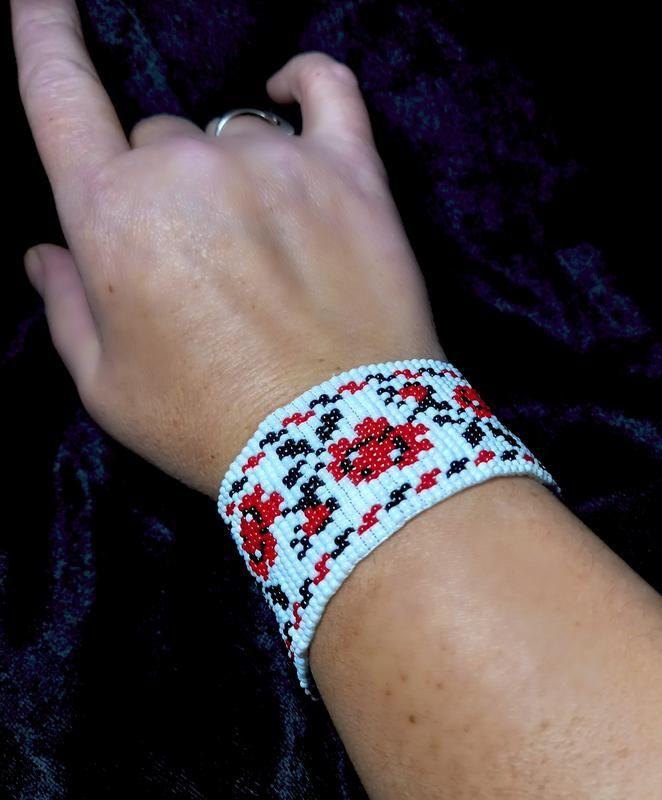 Браслет из чешского бисера в украинском стиле. Длина 17см + застежка-затяжка, что даёт регулировать размер по руке. Выполнен к гердану (см в моих работах) , но можно и отдельно. Дополнительные характеристики: Цвет : Белый Цвет : Красный Цвет : Черный Материал : Бусины Материал : Нитки