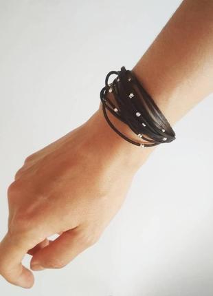 Ручная работа. Материалы: кожаный шнур, серебристые бусины и серебристая фурнитура. Застёжка - карабинчик и цепочка для регулирования размера браслета. Универсальный размер 16,5 -18,5 см. Возможен повтор в любом цвете и нужном размере. Дополнительные характеристики: Цвет : Черный Материал : Бусины Материал : Натуральная кожа Товар под заказ