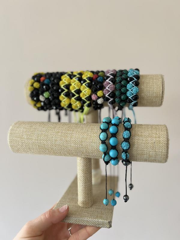 Браслети Шамбала - це ручна робота, що походить від давнього тибетського мистецтва. Вони зазвичай складаються з м'якого макраме-плетіння, яке утворюється з вузлів, а також мають різнокольорові нитки та кристали. Кожен браслет Шамбала вважається символом духовного зростання та гармонії. Вони використовуваться як прикраса або як предмет для медитації та духовної практики. Ці браслети часто носять як символ підтримки у дорогу до самовдосконалення.