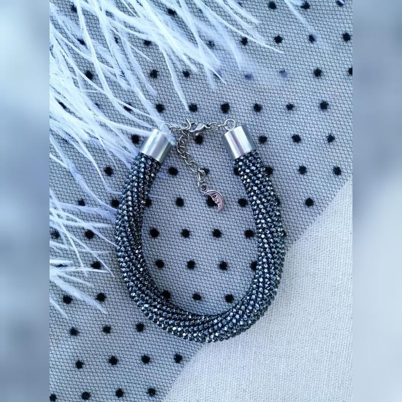 Вязаный браслет (жгут) из бисера серебристого цвета. Длина 18 см + 5 см удлинительной цепочки, диаметр 9 мм. Качественная фурнитура из нержавеющей стали. Дополнительные характеристики: Цвет : Серый Материал : Бисер