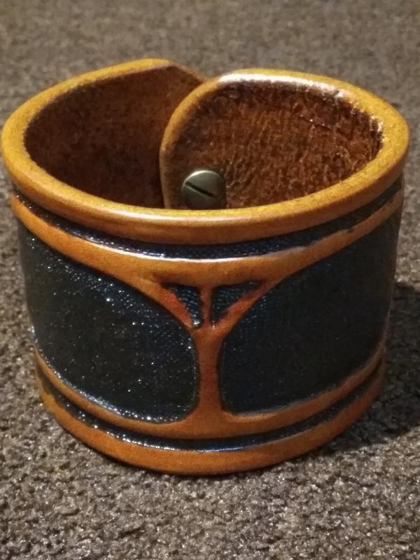 Кожаный браслет ручной работы, выполненный в технике тиснения. Застежка – кобурний винт. Ширина браслета – 5 см. Толщина кожи - 4 мм. На браслете изображен скандинавскую руну Альґіз. Основное значение руны Альґіз - защита. Руна призывает доверять собственной интуиции. Она указывает на то, что в критической ситуации или в момент, когда человек стоит на перепутье, ей непременно будет подан знак о том, как именно действовать и какое решение принять. Альґіз - это еще и защита от физического и магической опасности. Также можно сделать другого цвета и размера. Дополнительные характеристики: Материал : Натуральная кожа
