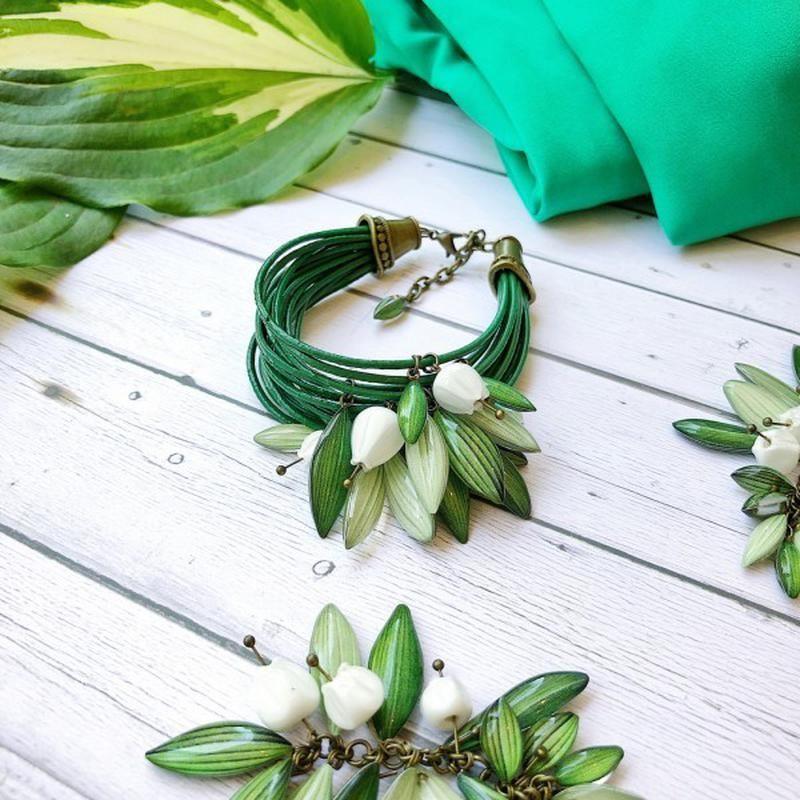 Браслет з авторськими двосторонніми підвісками з ювелірної смоли у вигляді стилізованих листків. Доповнено об'ємними намистинами з Муранського (Венеціанського) скла ручної роботи, імітація бутонів конвалій. Основа - кругленая натуральна шкіра зеленого кольору. Фурнітура - бижутерный сплав, колір - бронза. Розмір регулюється. Додаткові характеристики: Колір: Зелений Матеріал: Намистини Матеріал: Натуральна шкіра Матеріал: Епоксидна смола