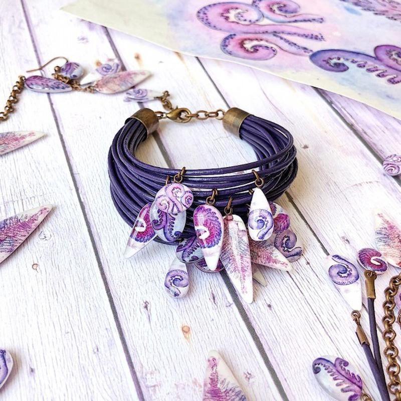 Браслет з фірмовими двосторонніми підвісками з ювелірної смоли з малюнком стилізованих восьминогів і папоротей. Основа - кругленая натуральна шкіра фіолетового кольору. Фурнітура - бижутерный сплав, колір мідь. Розмір регулюється. Додаткові характеристики: Матеріал: Натуральна шкіра Матеріал: Епоксидна смола