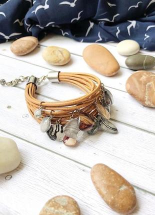 Браслет с фирменными двухсторонними подвесками из ювелирной смолы в виде стилизованных камней. Основа - кругленая натуральная кожа песочного цвета. Фурнитура - бижутерный сплав, цвет - серебро. Размер регулируется. Дополнительные характеристики: Материал : Натуральная кожа Материал : Эпоксидная смола