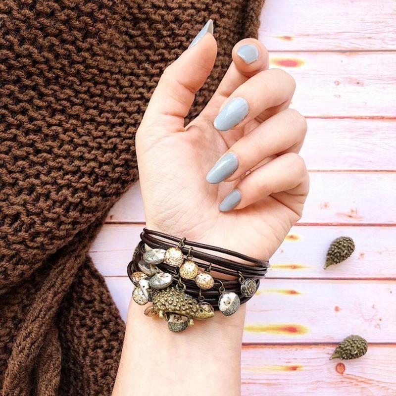 Браслет с фирменными двухсторонними подвесками из ювелирной смолы с изображением стилизованных ежей. Дополнен металлической подвеской в виде ежика. Основа - кругленая натуральная кожа коричневого цвета. Фурнитура - бижутерный сплав, цвет - бронза. Размер регулируется. Дополнительные характеристики: Материал : Эпоксидная смола