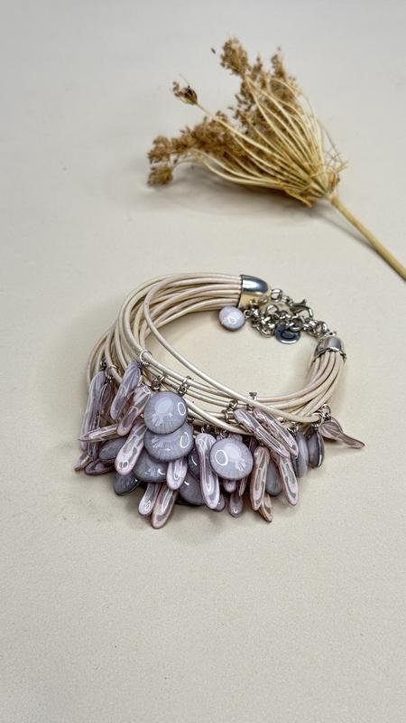 Браслет на основі з натуральної кругленої шкіри з ефектом металік та фірмові підвіски plumart у вигляді стилізованих балетних пачок та пуантів. Регулюється під одяг за рахунок додаткового ланцюжка. Додаткові характеристики: Колір: Бежевий Матеріал: Натуральна шкіра