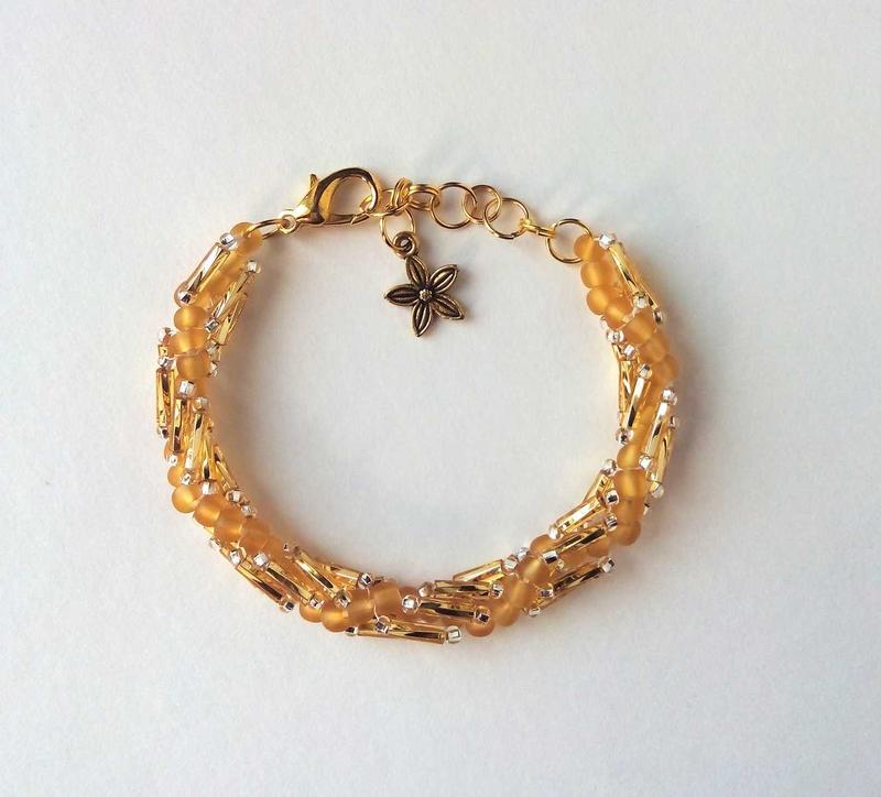 Браслет из полупрозрачного матового бисера и продолговатого стекляруса в виде объемного жгута заиграет разными оттенками желтого и песочного на вашем зап<unk> ястье при смене освещения. Браслет легко регулировать по длине благодаря дополнительным звеньям, а замочек украшает милая подвеска Цветочка. Дополнить браслет можно схоже с стилем намистом из моей коллекции украшений.