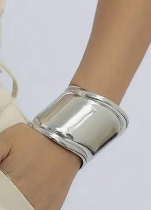 модный браслет серебряного цвета. Стильный широкий аксессуар. Хит сезона