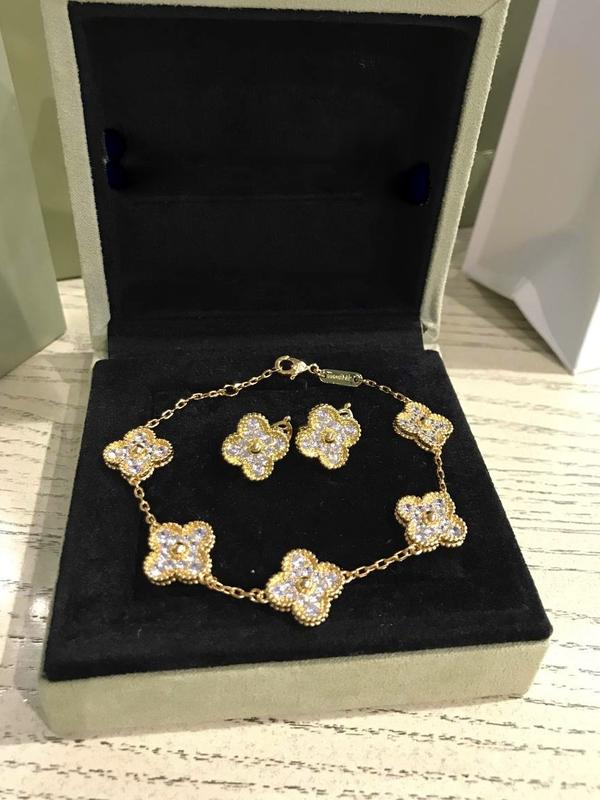 Элегантные и стильные украшения стиль Ванклиф, клевер. Браслет на 1 или 5 элементов. На всех браслетах есть гравировка и проба. Браслет можно приобрести комплектами с кольцами, серьгами и подвесками. Серьги есть гвоздики или английский замок. Серьги имеются на 1, 2, 3 или 4 элемента. Все украшения можно приобрести в подарочной упаковке.