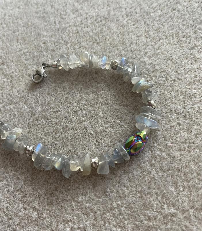 Браслет из натурального камня лабрадора, дополненный элементом сваровски в виде жука. Жук двусторонний ✅ 🪲 также возможно выполнение без вставок) Размер способен подобрать индивидуально 👍