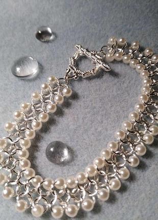 Браслет на руку Кальчужное плетение, металлические одинарные кольца, бусины. Застежка кольцо. Длина 16 см. Цвета и оттенки могут отличаться от оригинала, так как фото не передает точные цвета.