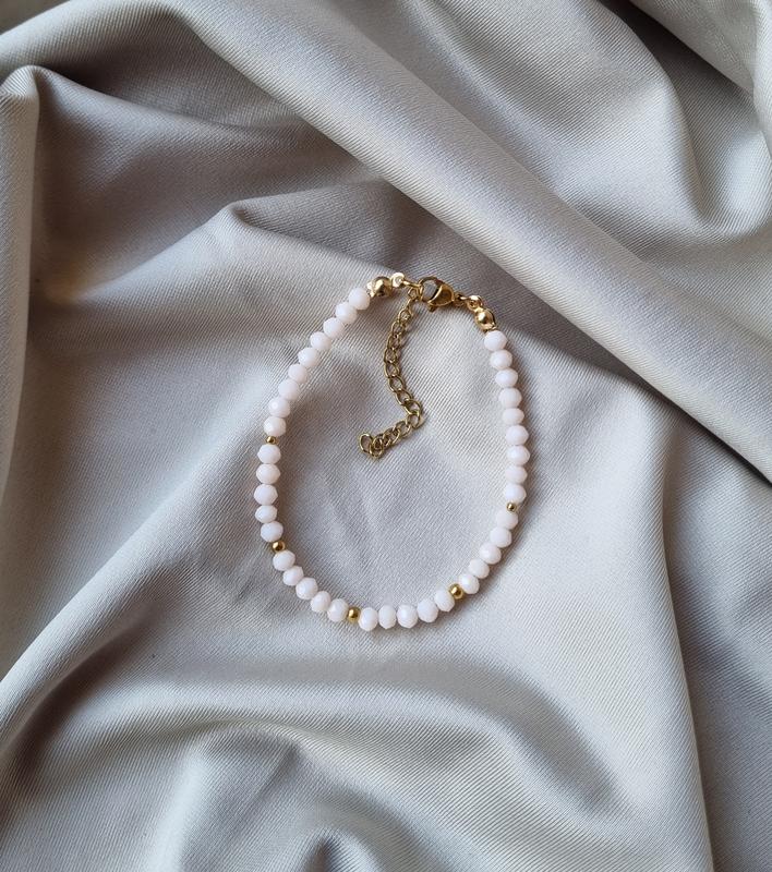Браслет выполнен из хрустальных бусин. Все металлические элементы из нержавеющей стали. Длина - 16 см + 5 см застежка удлинитель