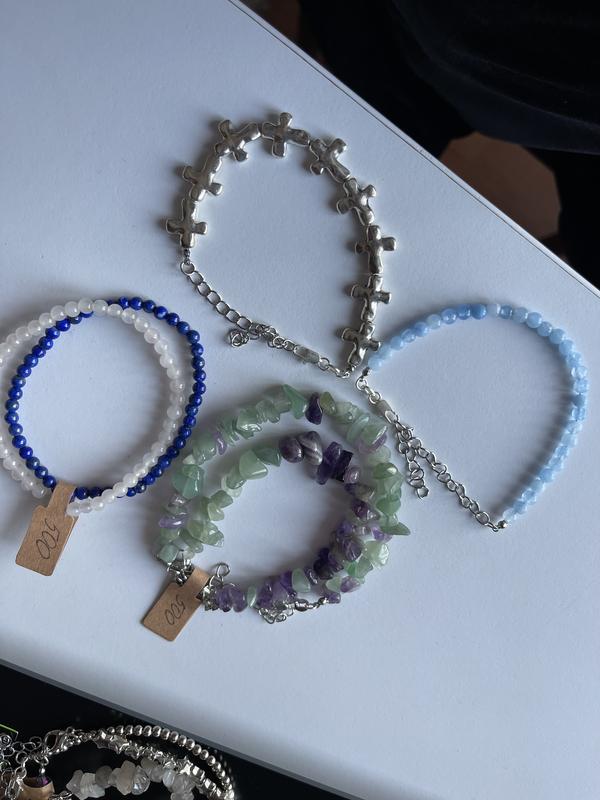 Два браслета (ляпис и кварц) = 500 грн Два браслета (аvьюрин и аметист) - 500 грн Браслет из аквамарина = 500 грн Браслет с крестами = 500 грн