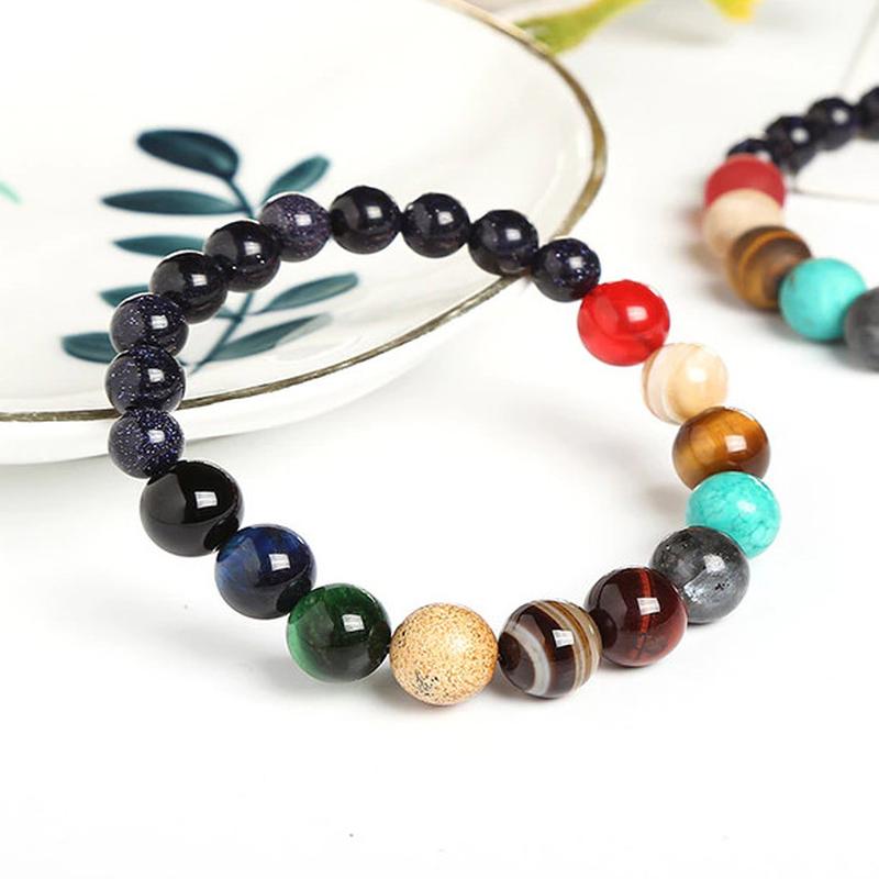 Браслет RESTEQ у вигляді планет нашої сонячної системи. Браслети з натурального каміння завжди в моді, це оригінально, зроблено з душею і дуже красиво. Браслет з натурального каміння здатний дати вам енергію, вплинути на перебіг подій у житті. Але оскільки потреби наші змінюються часто, відповідно і каміння може подобатися нам у різний проміжок часу абсолютно різні. Цей браслет містить натуральні камені різноманітних кольорів на зразок планет нашої сонячної системи. Ламаєте голову над подарунком подрузі, мамі, сестрі, дружині? - оригінальним і завжди до речі, буде браслет із напівдорогоцінного каміння. VA-1430293918
