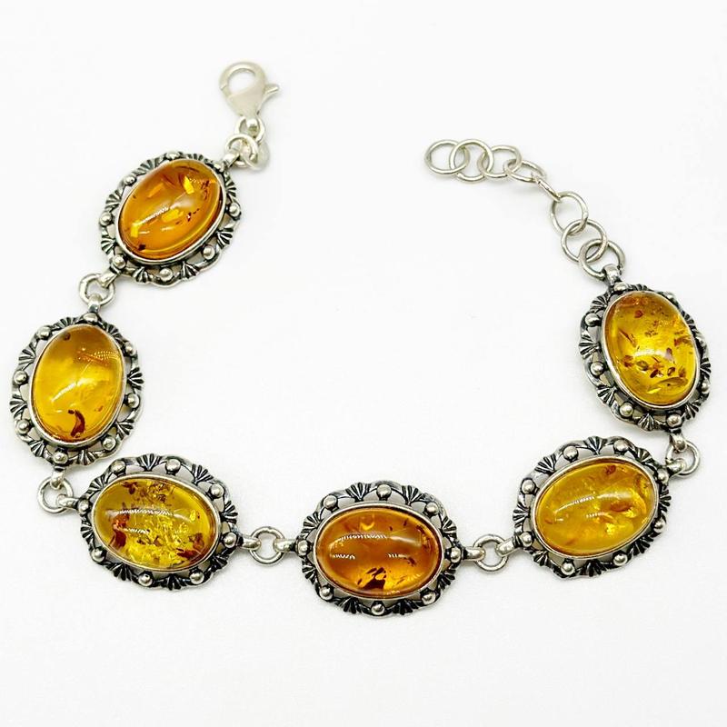 Серебряный браслет со вставкой янтарь, размер 17 см x 3 см, вес: 19.7 г