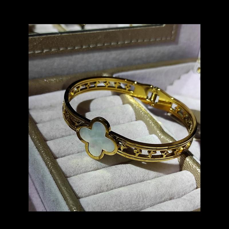 Браслет с большим клевером на пружинне под золото, медицинская сталь. Цена за один. В наличии черный -1 шт. белый -1 шт. На размер 16 -17