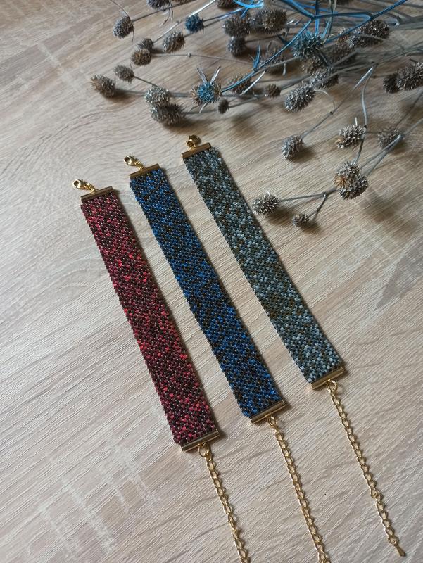Браслеты плетени из японского бисера. В разных цветах. Благодаря тому, что бисер сам по себе разноцветный, с нотками золотого, браслеты выглядят очень оригинально, изысканно. Ширина 2,5-3 см. Длина 15 см. Замок карабин с удлинительной цепочкой 7 см, что позволяет регулировать длину.