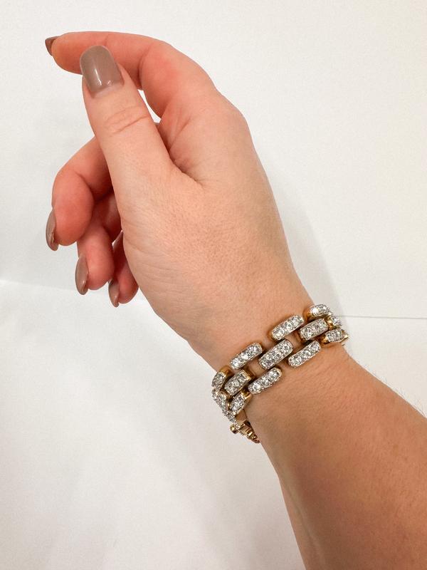✨ Элегантный блеск и изящная роскошь! ✨ Этот золотистый браслет с серебристыми вставками, инкрустированными кристаллами, настоящая находка для поклонниц классического стиля с ноткой гламурного шика. Универсальный аксессуар, что придаст яркий акцент как повседневному образу, так и вечернему наряду. Браслет от Carolee: когда детали говорят о вашем стиле. 💎 Длина 18,5 см, идеальное состояние