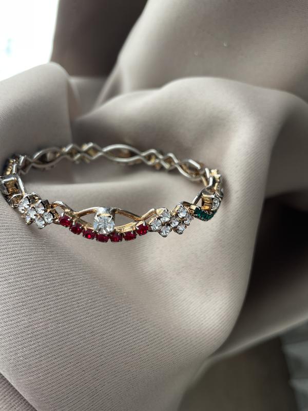Сяючий браслет з кристалами безколірними та червоного і зеленого кольору. Внутрішній діаметр 6см.